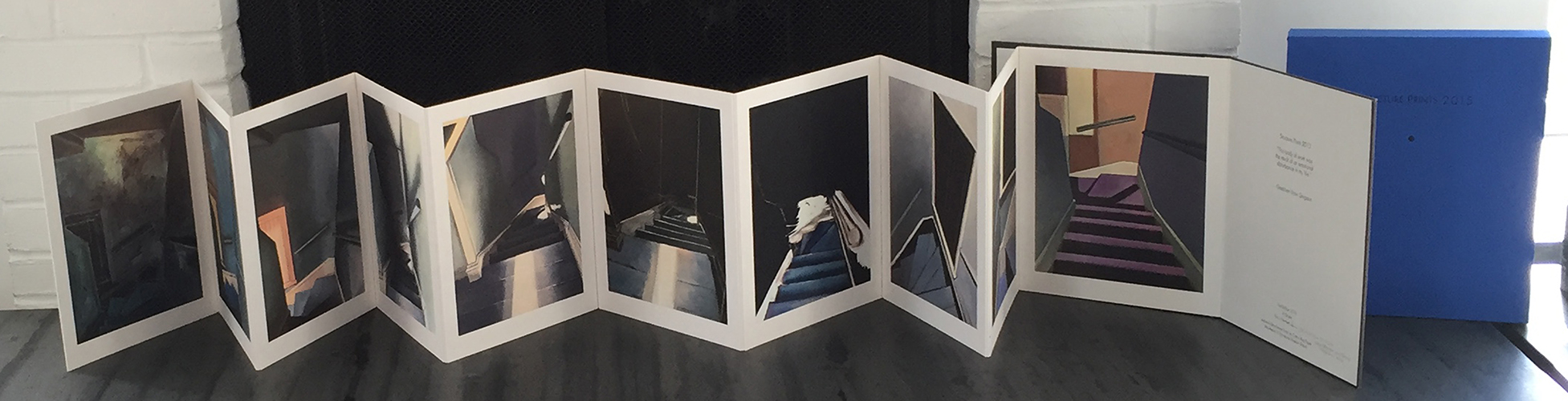 The paintings are 18" x 22" each , oil on linen, except for the first two which are oil on board. From those images, Structure Prints 2015 were formed from an original printing of ten numbered books containing ten archival prints from the paintings. This body of work was the result of an emotional disturbance in my life.